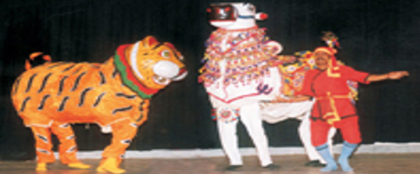 The Pasu Nritya or the Animal Mask Dance belongs to a majestic folk dance tradition of Orissa, particularly in the Ganjam district. Ma Byaghra Devi and Ma Thakurani are the popular Goddesses of this area. During festivals, when the idols are taken out on the streets (Thakurani Yatra), the masked dancers lead the procession in their colourful costumes. Pasu Nritya is also an important part of marriage ceremonies where the dancers lead the bridegroom and his family to the bride's house. The different kinds of animal mask dances include dances wearing the masks of lions, tigers, bulls, horse, deer, goats, peacocks, ducks etc. The movements vary according to the kind of animal the dancers represent. The animal's body is made out of a cane frame, which is richly decorated. Two dancers wear the cane frame representing the animal's body, while their legs become the quadruped beast's legs. The ring master (director) leads the animals around the stage accompanied by the drummers.