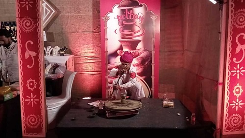 Rajasthani Kumhar is basically a Potter which makes the utensils out of mud or clay. These utensils hold a very special relevance in Rajasthan since it is a Land of Desert. The Rajasthani Kumhar can display their art and process of making utensils during various social events and fairs. These potters also teach guest- The Art of Pottery during the displays. This service is the main attraction for the Rajasthani Stalls Theme |